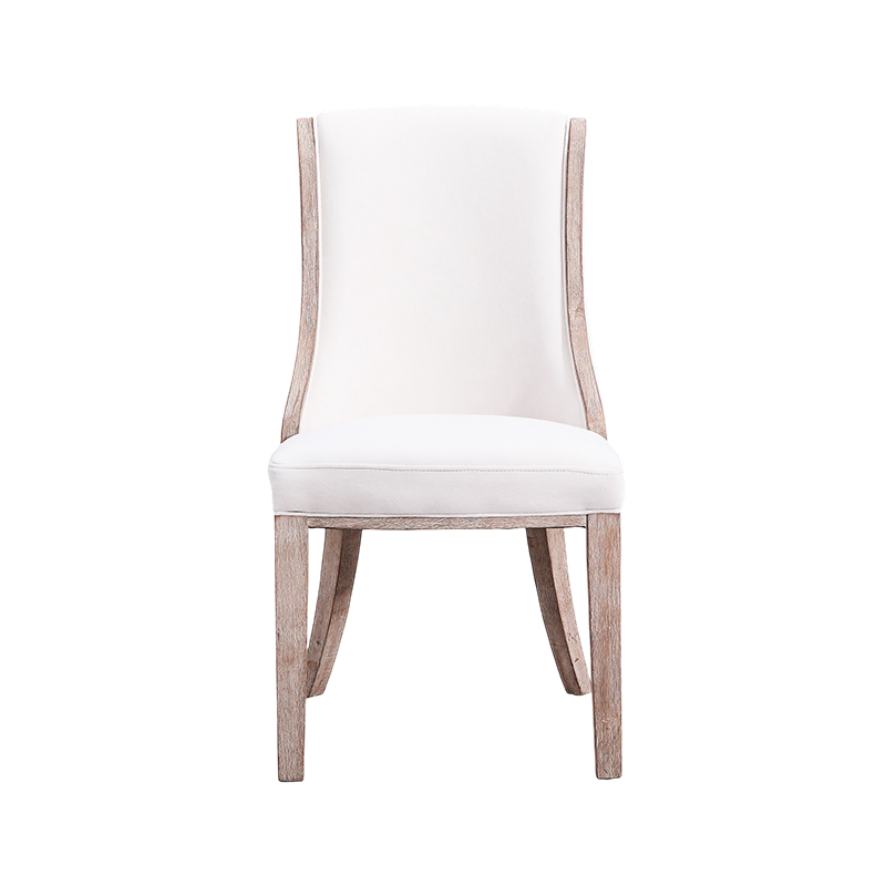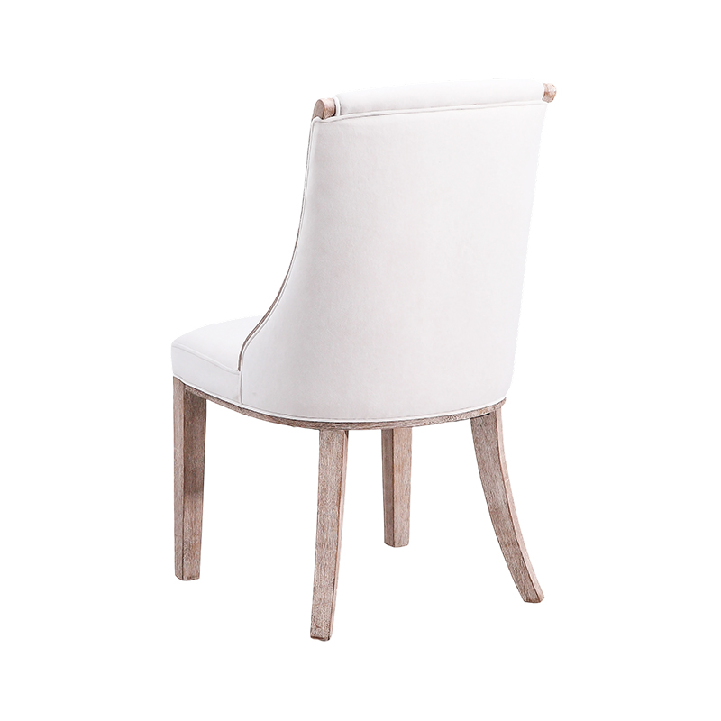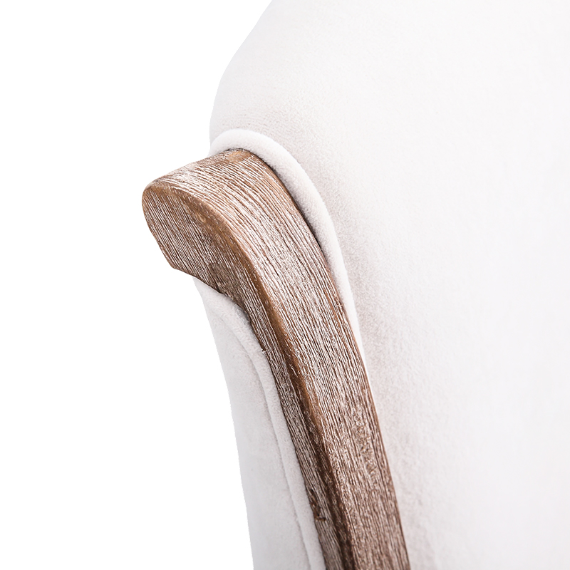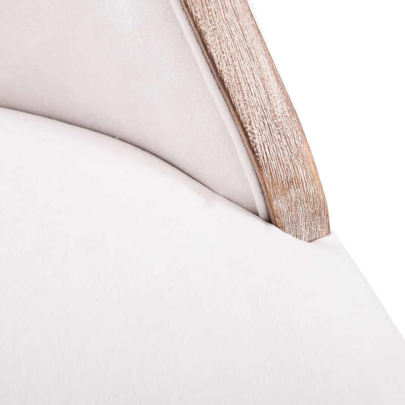El asiento cuenta con un cojín tapizado blanco liso, confeccionado con tela suave y transpirable con una textura suave. Su color limpio mejora la frescura general del espacio, mientras que el interior generosamente acolchado garantiza una comodidad duradera —ya sea que esté disfrutando de una comida larga o una conversación prolongada.