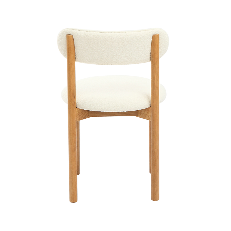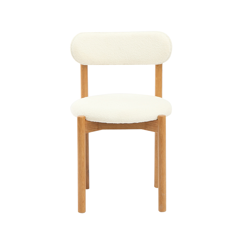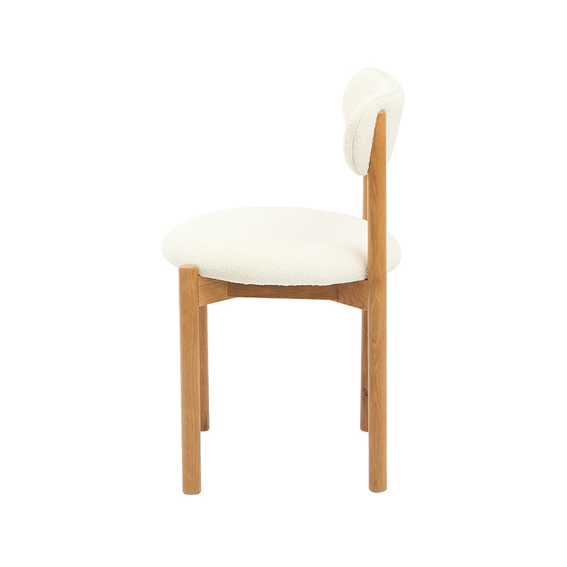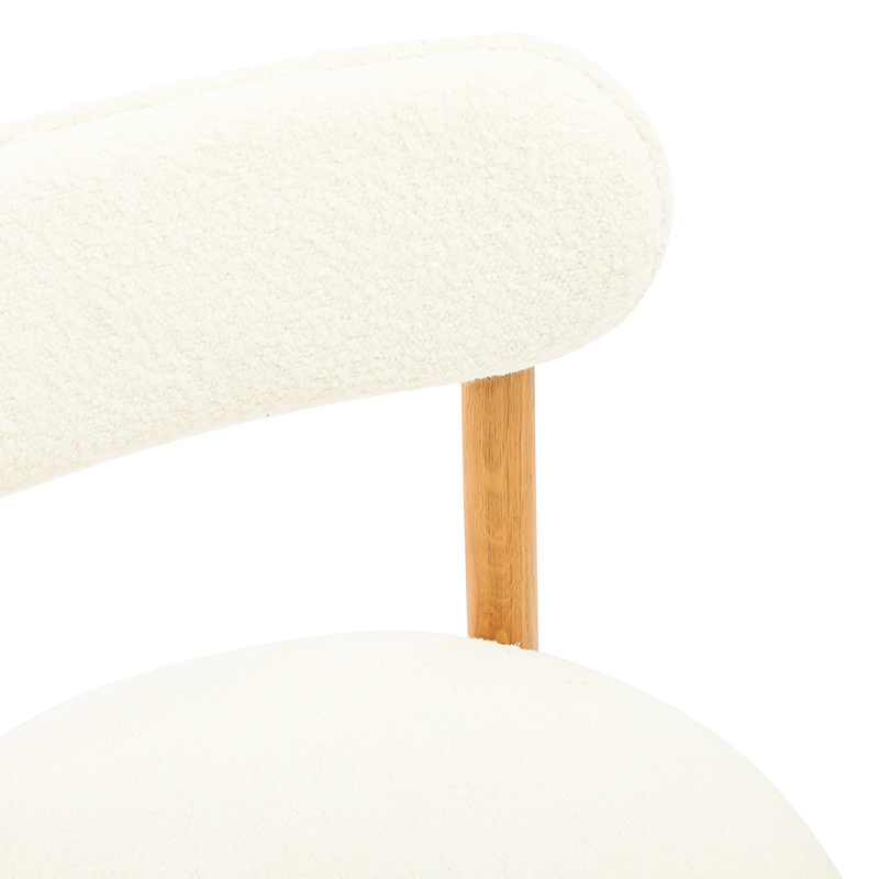 Tanto el asiento como el respaldo están tapizados en un suave tejido polar blanco, lo que ofrece una sensación acogedora y acogedora. La textura suave agrega una capa de comodidad que hace que cenar o conversar durante mucho tiempo sea más agradable, mientras que el tono blanco limpio combina sin esfuerzo con una variedad de interiores, desde el minimalismo moderno hasta la calidez rústica.